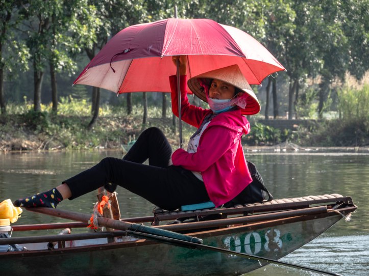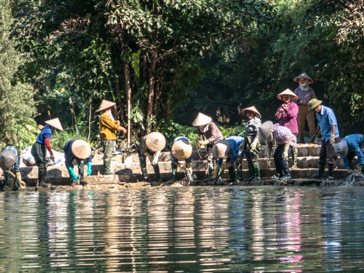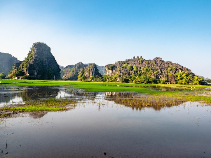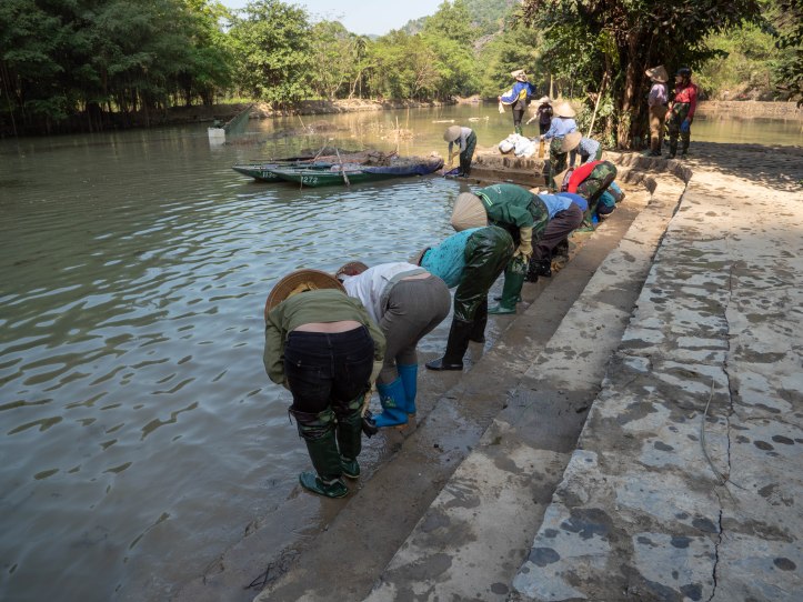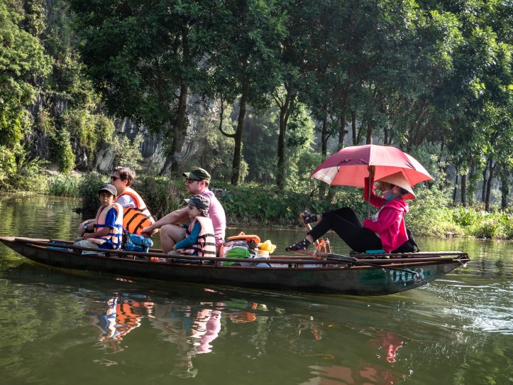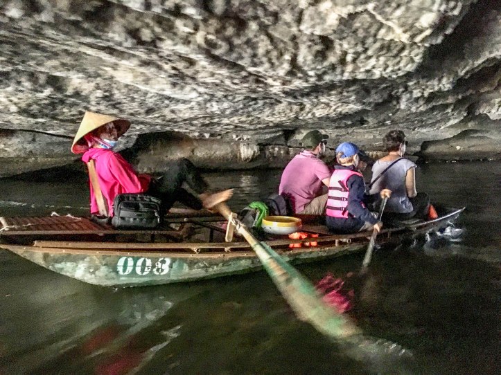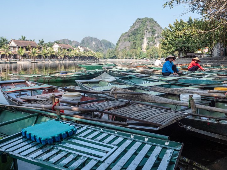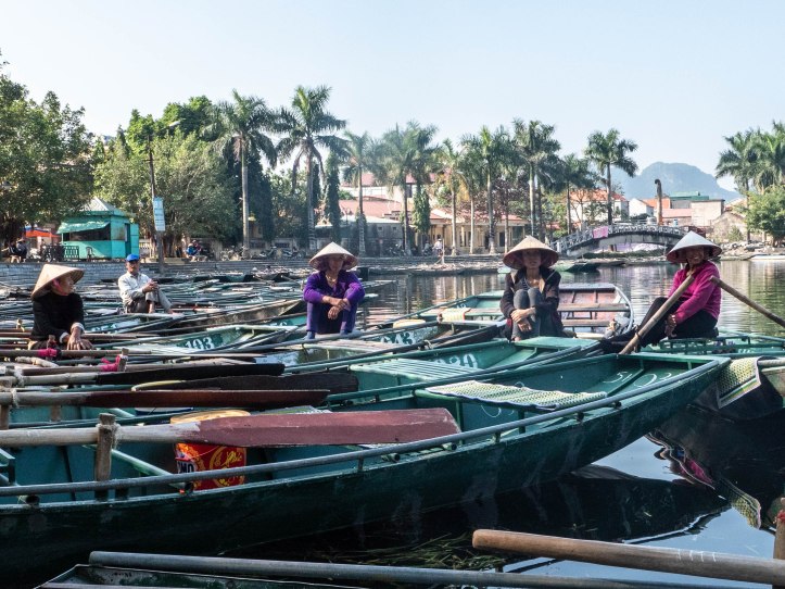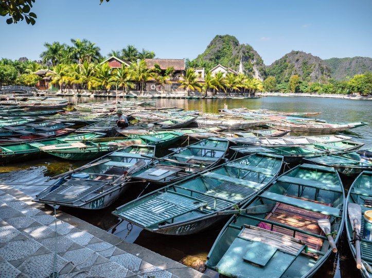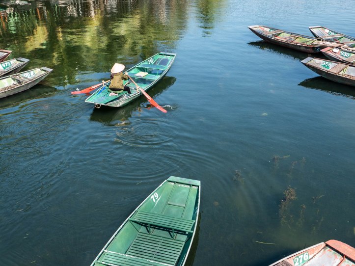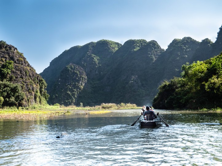Après Hanoï nous partons au petit matin dans une voiture privée pouvant contenir 9 personnes vers Ninh Binh lieu de la fameuse baie d’Halong terrestre. Nous arrivons dans la matinée à Tam Coc. Nous voyons apparaître ce qui fait la beauté de cette région: des formations rocheuses karstiques qui sortent de terre. Malgré le côté plus terrestre que la classique baie d’Halong nous arrivons près d’une embarcadère d’où nous partons pour une « croisière » le long de la rivière qui se trouve entre ces montagnes rocheuses. La ballade est agréable et le tour est bien rodé. Les paysages sont magnifiques, il fait beau et pas trop chaud. Nous regretterons le côté touristique un peu trop marqué avec des vendeurs qui essayent de vendre à tout prix une carte, un objet, un fruit.