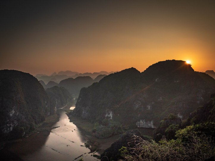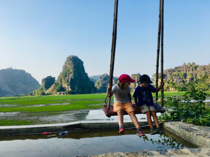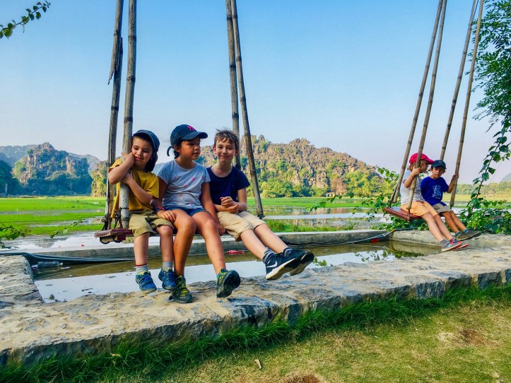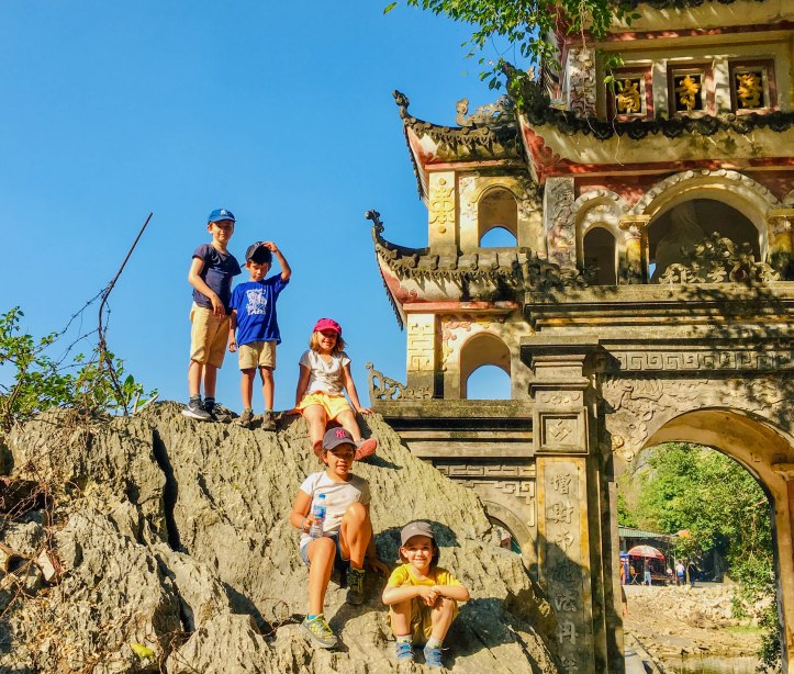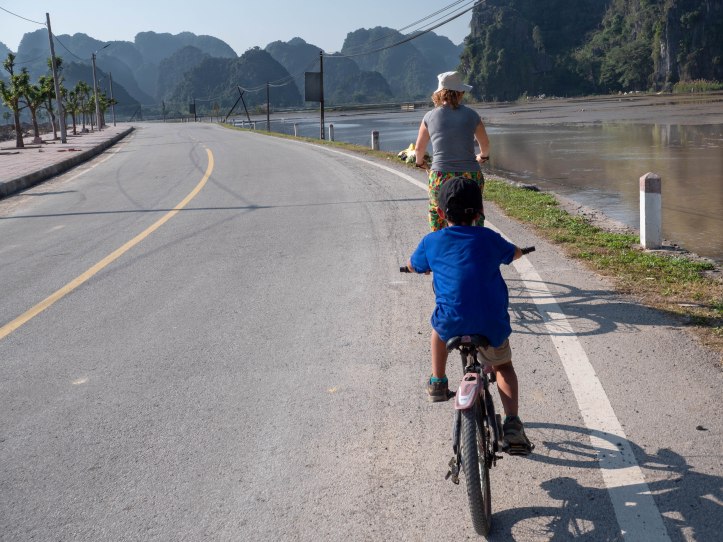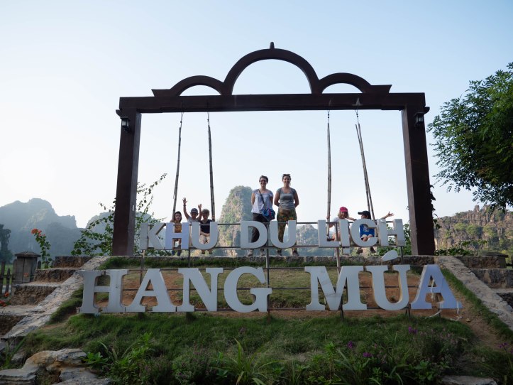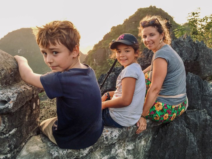 Nous sommes allés d’abord visiter la pagode Bich Dong puis nous nous sommes dirigés vers la Mua Cave qui présente un point de vue d’où nous pouvions voir le coucher du soleil. Pour l’atteindre il a fallu grimper de nombreuses marches et même le monde au sommet ne gâchera pas notre plaisir de voir un magnifique jeu d’ombres et de lumières sur les montagnes environnantes. C’était très beau. Nous avons beaucoup aimé nous balader à vélo tous ensemble. Il n’y a pas eu de blessé juste une petite chute du vélo de Jules car son siège était mal fixé… c’est sûr qu’au Vietnam on ne nous fournissait pas de casque ni de lumière et que le retour de nuit sur la grande route ne s’est pas fait sans inquiétude.