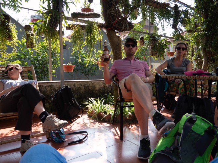 De retour de ballade il est 11h30, un peu tôt pour déjeuner, mais nous cherchons un endroit agréable où se poser. Nous avions faim car nous n’avions pas pu avaler de petit déjeuner avant de partir et cela se faisait ressentir. Nous avons trouvé un peu au hasard une homestay qui s’avérera être notre point de chute pour toute la journée. Le déjeuner est agréable, une grande table nous est dressée à l’extérieur et tout est fait pour se sentir à l’aise. Là où nous nous trouvons il n’y a quasiment pas de circulation et les enfants peuvent jouer en tout tranquillité à… casser des briques … oui oui !