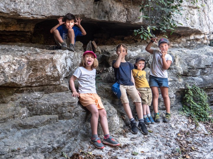Après le déjeuner la propriétaire souhaite nous aider à organiser notre après-midi. Elle nous trouve des vélos à louer et nous indique où aller nous balader. Nous avions donc 6 vélos adultes qui allaient aussi à Augustin et Anna; Noémie et Jules sont allés sur les portes bagages et nous avons récupéré le vélo du fils du proprio pour Emilio .. on était même un peu gêné car nous avons eu un peu l’impression de lui piquer son vélo pour quelques heures. Nous partons à la queue leu leu nous promener à vélo entre les formations rocheuses. C’était très agréable et joyeux d’être tous ensemble. La nature était très belle.
