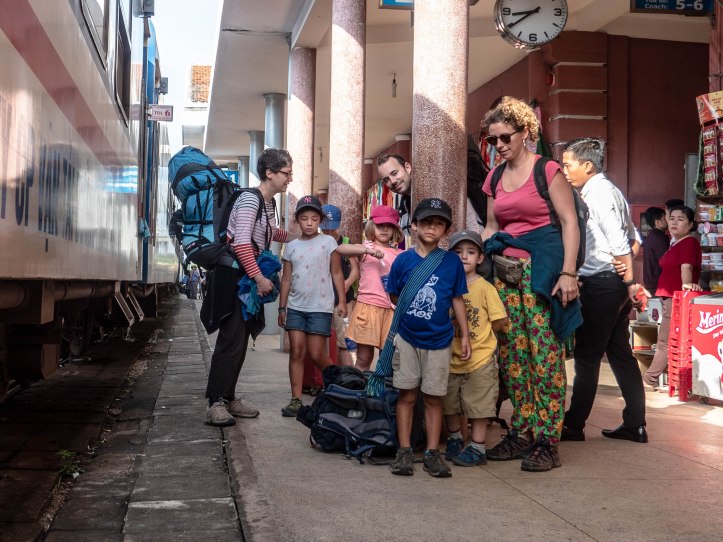 Nous avions laissé nos affaires au homestay et nous avons même pu nous y doucher avant d’aller prendre notre train pour Hue. Le train était très attendu par les enfants car c’était un train couchette !! Je leur avait tellement parlé des trains couchette de mon enfance que je prenais pour aller à la montagne qu’ils en rêvaient ! ( oulala cela ne me rajeunit pas ..) Nous avons donc pris le train vers 21h45 à Ninh Binh direction Hue. Nous étions dans des cabines de 6 couchettes. Les enfants étaient excités et on les a tous mis ensemble dans le même compartiment et moi avec !