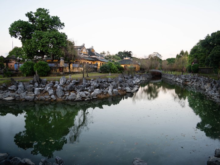 Après ce bon déjeuner et l’achat d’une nouvelle paire de lunettes de vue pour Marco nous sommes partis à l’assaut de la cité impériale de Hue. La citadelle est entourée de gros remparts et de douves et après y être entré on pénètre dans la cité impériale, l’ancienne demeure des empereurs. C’est un lieu calme et paisible loin du bruit de la ville. Nous nous y sommes baladés tout l’après midi jusqu’à la tombée de la nuit. Nous étions quasiment les derniers à sortir. En fin de journée il n’y avait presque plus personne. Les enfants couraient dans tous les espaces extérieurs. Le temps était magnifique ainsi que la température et nous avons fait de nombreuses parties de cache cache et du jeu de la sardine entre les temples. Ce fut une amusante façon de les découvrir.