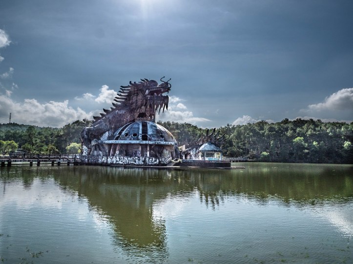 Nous sommes ensuite allés visiter la tombe de l’empereur Khai Dinh, temple très grandiose avec un palais entièrement fait de mosaïque de carreaux de céramique, un peu kitsch et nous avons terminé par un monument en forme de dragon dans lequel on pouvait grimper jusqu’à sa gueule. Ce dragon était attendu des enfants et nous sommes arrivés dans un endroit improbable en découvrant sur un lac une grosse structure de béton en forme de dragon laissée à l’abandon. L’endroit était sale et plein de graffitis sur les murs, beaucoup moins attirant en vrai que sur les photos.