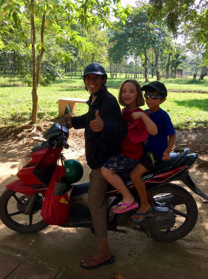Mr Lac ne montait pas avec nous dans la voiture mais nous suivait en scooter. Alexis et Marco l’ont successivement accompagné derrière le scooter et sur de courtes distances et les enfants aussi… sans casque évidemment.. C’est le premier pays d’Asie où l’on voit les gens vraiment porter le casque à moto. Par contre les enfants accompagnants leurs parents n’en ont jamais .. il ne faut pas chercher de logique à cela.