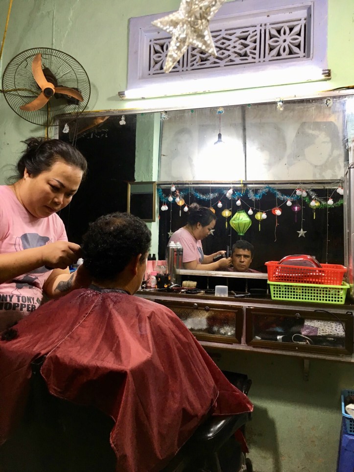Nous sommes arrivés sous le soleil à Hoi An et l’hôtel réservé par Alexis avait une piscine. Même si les chambres n’étaient pas encore prêtes les enfants ont sauté gaiement dans la piscine. Nous sommes allés déjeuner dans un bar restaurant à côté. Dans ce bar très couleur locale il n’y avait que des groupes d’hommes qui passaient là leur après midi à boire des bières. Ils commandaient des seaux entiers de glaçons remplis de cannettes de bière. Une fois la canette terminée elle finissait sous la table. Imaginez le monticule de canettes vides en fin de journée!! Par le plus grand des hasards nous avons croisé dans ce bar restaurant Thomas et Stéphanie ( tourdumondistes comme nous) déjà rencontrés à Siem Reap qui partageront une bière avec nous et nous raconterons leurs aventures des semaines passées. Dans l’après midi nous sommes partis tous à vélo (sauf Augustin encore souffrant) pour le centre ville d’Hoi An. Plus nous nous approchions et plus il y avait de monde, à tel point qu’il était difficile de ne pas renverser quelqu’un à vélo. Nous avons garé les vélos et sommes partis nous promener dans la ville; il y avait beaucoup de monde mais l’animation autour de la rivière était sympathique. Marco, Alexis et Emilio en ont profité pour se faire une nouvelle coupe de cheveux.
