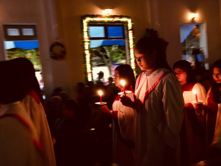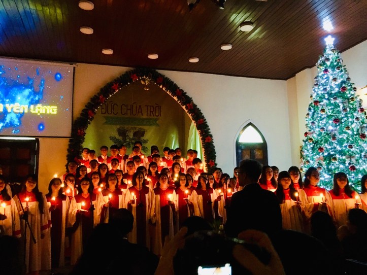 Nous avions décidé de trouver une messe de Noël vietnamienne. Nous avons trouvé une église dans le centre ville et nous y sommes allés avec un peu d’avance pour avoir une bonne place. L’église était bondée, nous avons trouvé un banc devant comme s’il nous attendait. La messe a commencé au haut parleur avec une musique de fond ressemblant à star wars. Nous ne voyions pas de prêtre en soutane mais un monsieur en costard au micro. Il y avait devant nous des asiatiques avec des écouteurs dans les oreilles. Nous avons compris que c’étaient des touristes Sud coréens, qui avaient un traducteur qui leur retransmettaient la messe. Bon, nous n’avons pas compris grand chose juste quelques « Jesus » ou « alléluia » mais rien de plus. Après un premier temps de parole c’était le temps musical et se sont succédées plusieurs chorales d’hommes, de femmes, d’enfants qui chantaient des chants de Noël. Nous avons reconnu « douce nuit » en vietnamien. Après 1h30 de chants nous étions surpris de n’avoir entendu aucune liturgie. Nous avons décidé de partir car une table nous attendait pour 21h dans un restaurant du centre ville. Je n’ai pas vraiment eu le sentiment d’avoir participé à une messe de Noël plutôt à une chorale mais c’était intéressant.