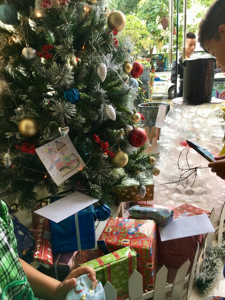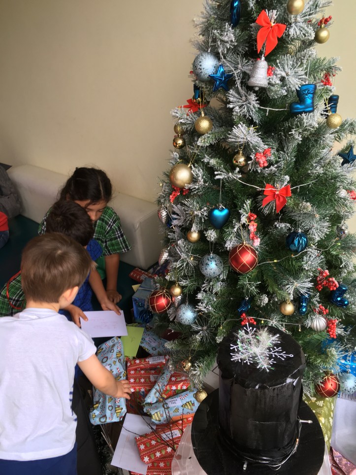 Réveillés par les enfants qui n’ont pas trouvé de cadeaux devant leurs chaussures laissées devant la porte ( ou plutôt leurs tongs..). Nous décidons alors de descendre dans le hall d’entrée de l’hôtel où se trouvait un joli sapin synthétique et là les enfants ont découvert quelques paquets avec leurs noms inscrit dessus. Ouf!! le père Noël était bien passé !! Les enfants ont reçu un masque de plongée chacun. Merci à la commande décathlon arrivée directement de France avec mon frère 😉. Le personnel de l’hôtel était très amusé de voir les enfants découvrir les cadeaux. Ils ont pris pleins de photos de nous.