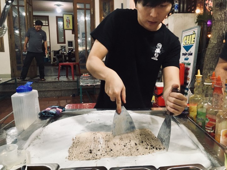 Nous sortirons le soir dans le centre ville d’Hoi-An toujours bondé. Les rues de nuit et la rivière s’éclairent de multiples lanternes colorées. C’était très joli. Les hauts parleurs des rues décorées entonnaient des chants de Noël religieux ou non. C’était étonnant. Nous avons trouvé un super restaurant près du night market où marco a goûté un œuf fécondé, grande spécialité locale. Il s’est régalé. Nous goûtons également aux « glaces rouleaux ». On choisi une saveur, mangue par exemple et sur une plaque métallique glacée le vendeur coupe la mangue en petits morceaux, ajoute un mélange lacté et il travaille le tout sur la plaque glacée. Le mélange se glace petit à petit et fini en petits rouleaux glacés à déguster.