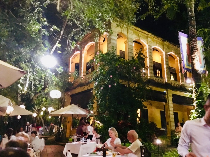 De retour à l’hôtel, plouf général dans la piscine puis nous sommes allés dîner dans un restaurant à coté de l’hôtel qui venait d’ouvrir apparemment. L’hôte était charmant et très gentil mais vraiment les plats n’étaient pas très bons. Nous avons vu une succession de bestioles à 4 pattes et grandes queues 🐀 passer entre les tables (comme souvent ici mais cela ne met pas en confiance…) Au Vietnam les plats sont rarement servis tous ensemble. Nous avons bien ri car nous avions commandé la spécialité de Hoi An : un Cau Lau. Les autres plats étaient servis mais pas celui là et nous en avions commandé trois. Nous avons vu le cuisinier partir sur son scooter et ramener dans des boites en polystyrène nos 3 Cau Lau commandés, probablement achetés dans une gargote non loin, puis sans aucune discrétion il nous les a servis dans un bol en céramique. Pas très classe …