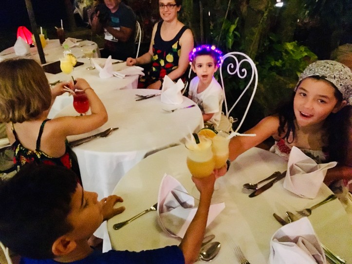 Le soir nous étions invités par le père Noël 🎅 à dîner en ville. Nous sommes arrivés dans un superbe restaurant avec une belle terrasse extérieure donnant vue sur la rivière. Les tables étaient dressées sous des arbres auxquels étaient accrochés des lanternes colorées. Nous nous sommes régalés en débutant par de bons cocktails petits et grands. J’ai dîné de gambas cuites dans une noix de coco, Anna s’est régalée avec une bonne viande de bœuf avec des frites. C’était notre dernier dîner partagé avec Alexis, Anne et les cousins. Merci à eux pour ce superbe dîner. Nous sommes tous rentrés en vélo dans la nuit vers l’hôtel.