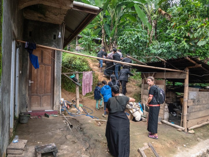 Ensuite le corps du défunt dans son cercueil a été transporté par un petit chemin montant vers une prairie. Cette prairie avait été préparé pour l’occasion avec une dizaine de cabanes ouvertes en bambous préparées pour accueillir les villageois. Le cercueil a été placé dans une maison accueillant les morts en attendant d’aller dans un caveau le lendemain. Avec le cercueil ont été déposés de nombreuses affaires de l’enfant, des jeux, son cartable et même son ventilateur.